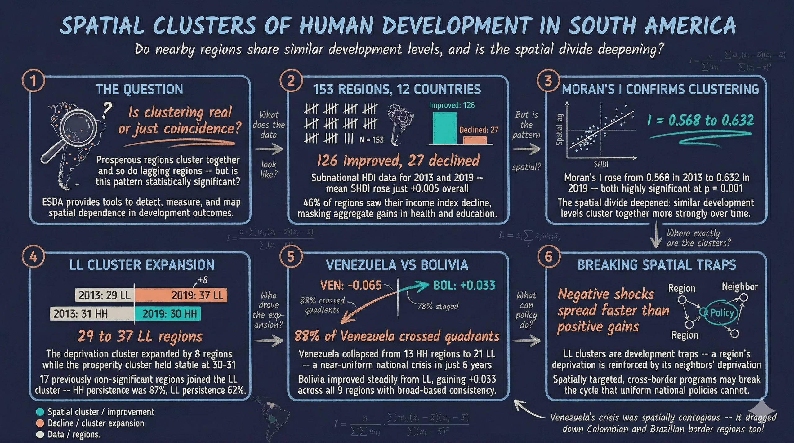 For policy, these findings suggest that spatially targeted interventions may be more effective than uniform national programs. The persistent LL clusters represent development traps where a region’s own conditions are reinforced by the equally poor conditions of its neighbors. Breaking these traps may require coordinated cross-regional or cross-border programs that address the spatial dimension of underdevelopment. Bolivia’s experience suggests that broad-based national improvement can lift all regions, but escaping the low-development spatial cluster may require the additional step of improving neighbors' conditions simultaneously — a challenge that calls for cross-border cooperation.