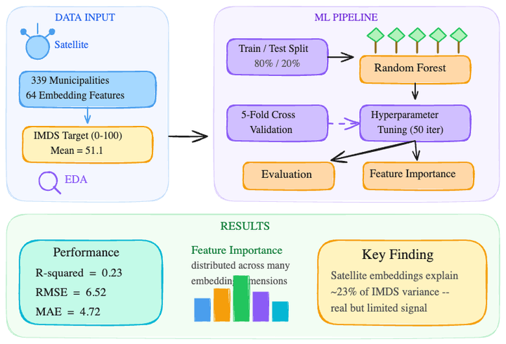 This analysis demonstrates that satellite embeddings contain real predictive signal for municipal development outcomes, but several limitations apply: