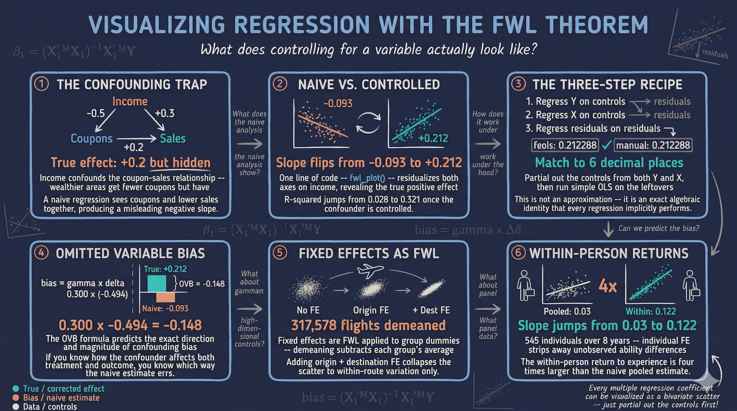 fwl_plot(), the estimate was +0.212, recovering the true effect. - The OVB formula predicts the bias exactly: the bias was $0.300 \times (-0.494) = -0.148$, correctly predicting the negative direction and approximate magnitude of the confounding.