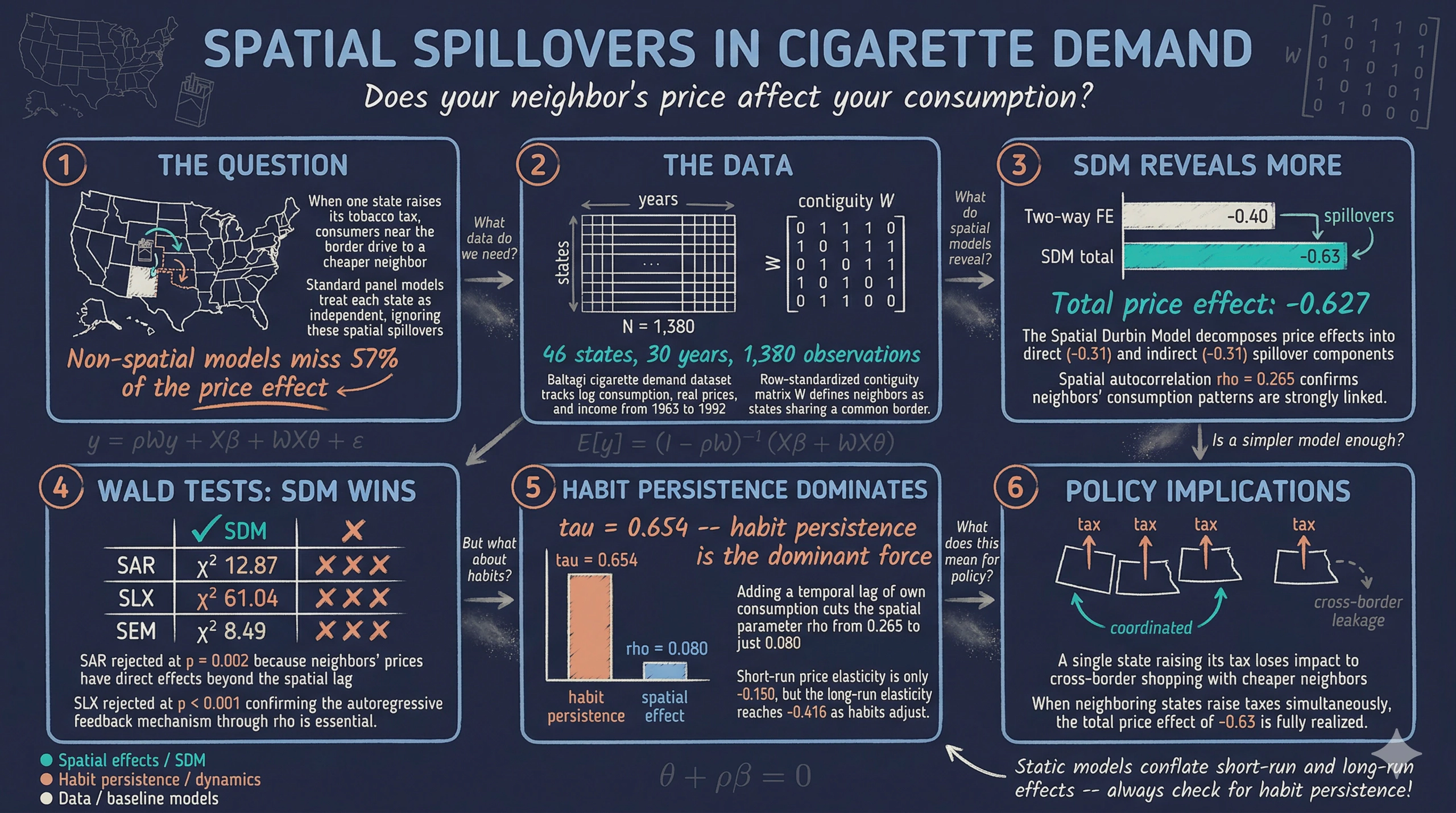 All three Wald tests reject the restricted models. The SDM cannot be simplified to SAR (neighbors' X variables matter), SLX (the autoregressive feedback matters), or SEM (the spatial dependence is substantive, not a nuisance). The full SDM is the appropriate specification for modeling cigarette demand across US states. This result confirms that spatial spillovers in cigarette consumption operate through multiple channels simultaneously: direct cross-border effects of neighbors' prices and incomes, and feedback effects through the spatial lag of consumption itself.