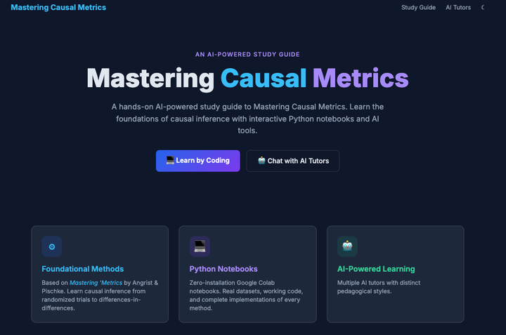 An AI-powered study guide to Mastering Causal Metrics. Learn the foundations of causal inference with interactive Python notebooks and AI tools, based on the foundational textbook Mastering ‘Metrics: The Path from Cause to Effect by Angrist & Pischke.